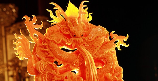 果蔬雕刻,又称餐桌上的艺术。以常见的蔬菜、瓜、果为原料,通过切、旋、削、戳、刻等手法,把它变成玲珑剔透、 栩栩如生的花卉、走兽、人物、风景,化平凡为神奇,使得大宴小酌面目一新,给人一种充满情趣的餐饮气氛。